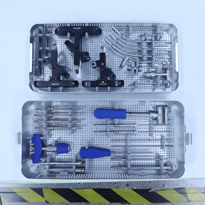The distal tibia instrument set contains a variety of high-precision surgical tools for reduction and fixation of distal tibial fractures. The kit includes positioning arms, coupling connectors, aiming jigs of various specifications, trocars, connecting bolts, trial pieces, protective sleeves, quick couplings, wrenches, guide wires, and an aluminum storage box. The components work together to achieve precise positioning, stable fixation, and minimally invasive procedures, facilitating efficient and safe orthopedic surgeries.