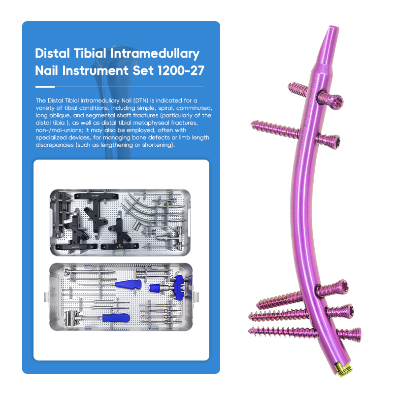 The Distal Tibial Intramedullary Nail (DTN) is indicated for a variety of tibial conditions, including simple, spiral, comminuted, long oblique, and segmental shaft fractures (particularly of the distal tibia), as well as distal tibial metaphyseal fractures, non-/mal-unions; it may also be employed, often with specialized devices, for managing bone defects or limb length discrepancies (such as lengthening or shortening).