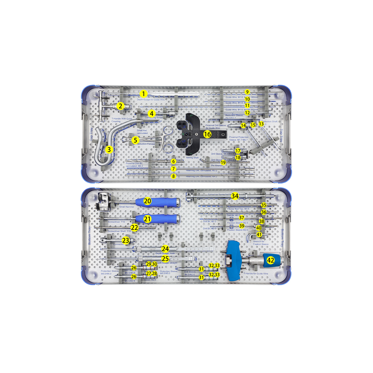 Used to secure the main nail to the bone, preventing rotation and shortening. Includes static locking screws (rigid fixation) and dynamic locking screws (allowing axial compression).