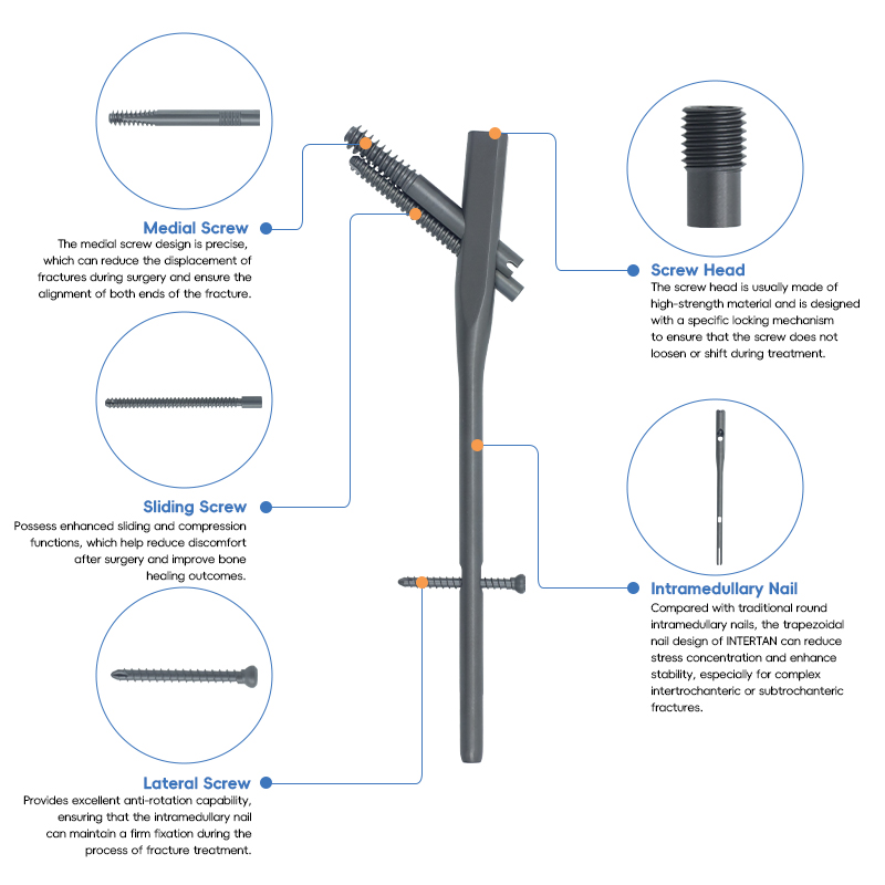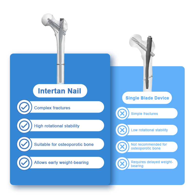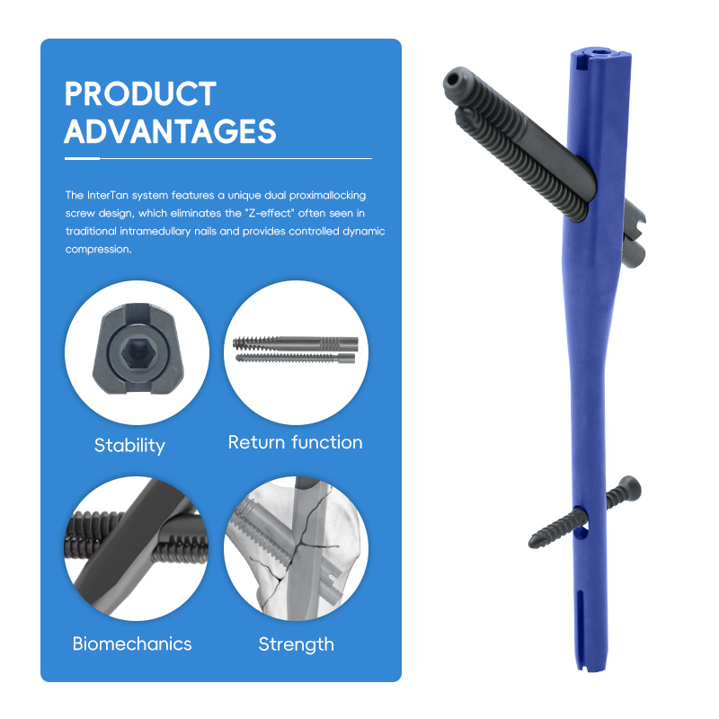 Compared with traditional round intramedullary nails, the trapezoidal nail design of INTERTAN can reduce stress concentration and enhance stability, especially for complex intertrochanteric or subtrochanteric fractures.
