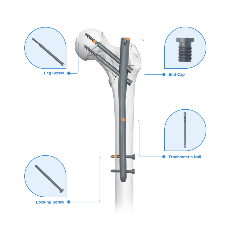 Includes guide wires, reamers, staple inserters, locking screws, aiming devices, drill limiters, spanners, measuring tools, etc. for femur fracture reduction and fixation, covering the surgical procedures of positioning, reaming, implantation and locking to ensure precise handling and stability.